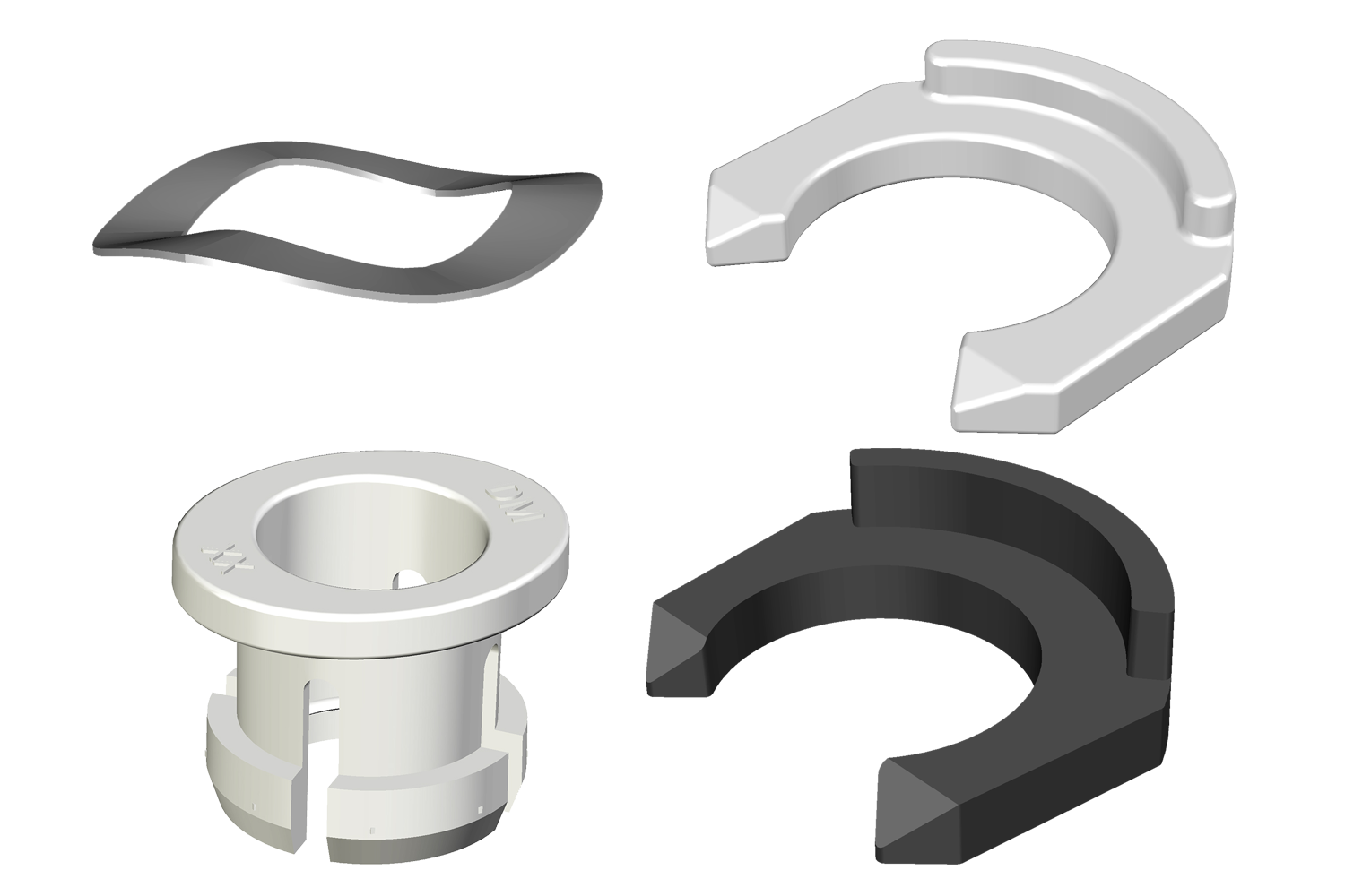 20x buiskoppeling-collet, 20x witte klemclip, 20x zwarte klemclip en 20x golfschijfveer.