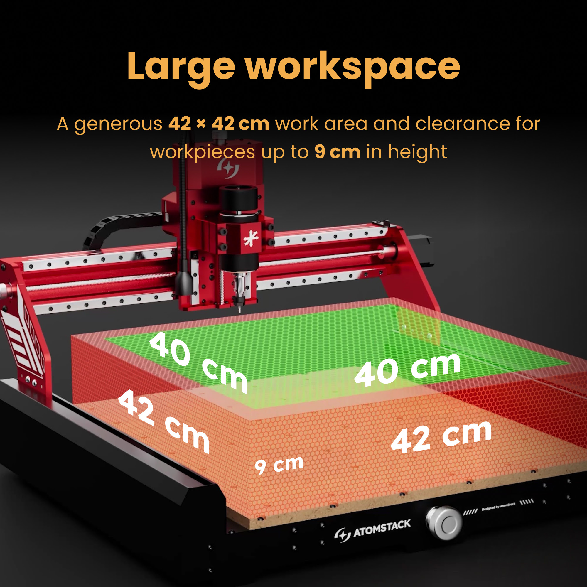 Een groot werkgebied van 42 × 42 cm en een werkhoogte tot 9 cm maakt het mogelijk om al je projecten te realiseren.