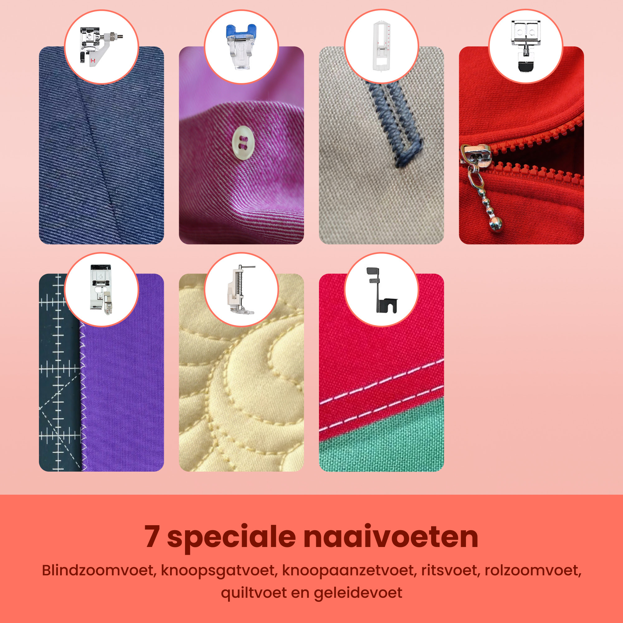 - Knoopaanzetvoet: bevestig knopen stevig en eenvoudig