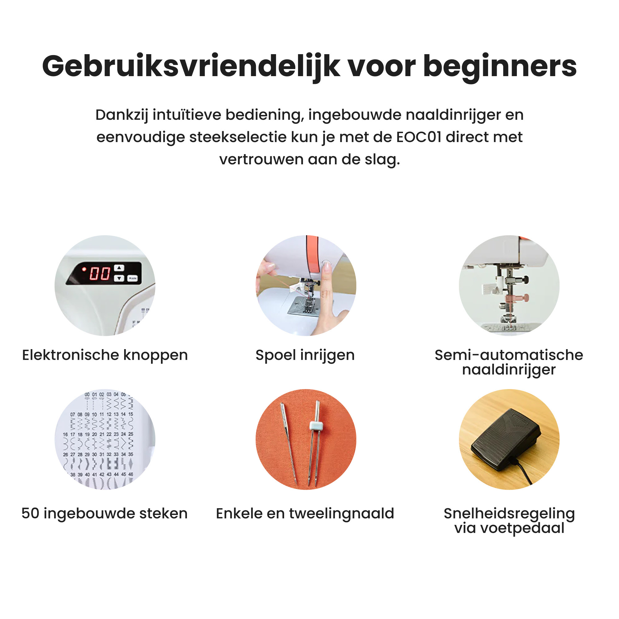 Stel je voor: projecten sneller afwerken zonder in te boeten op kwaliteit. Met vertrouwen aanpassingen uitvoeren, woondecoratie maken of handgemaakte cadeaus creëren die eruitzien alsof ze uit de winkel komen. Met de EOC01 behoren frustraties zoals verwarde draad en onregelmatige steken tot het verleden. Je verliest minder tijd aan zoeken naar oplossingen en wint meer tijd om creaties te maken waar je trots op bent.