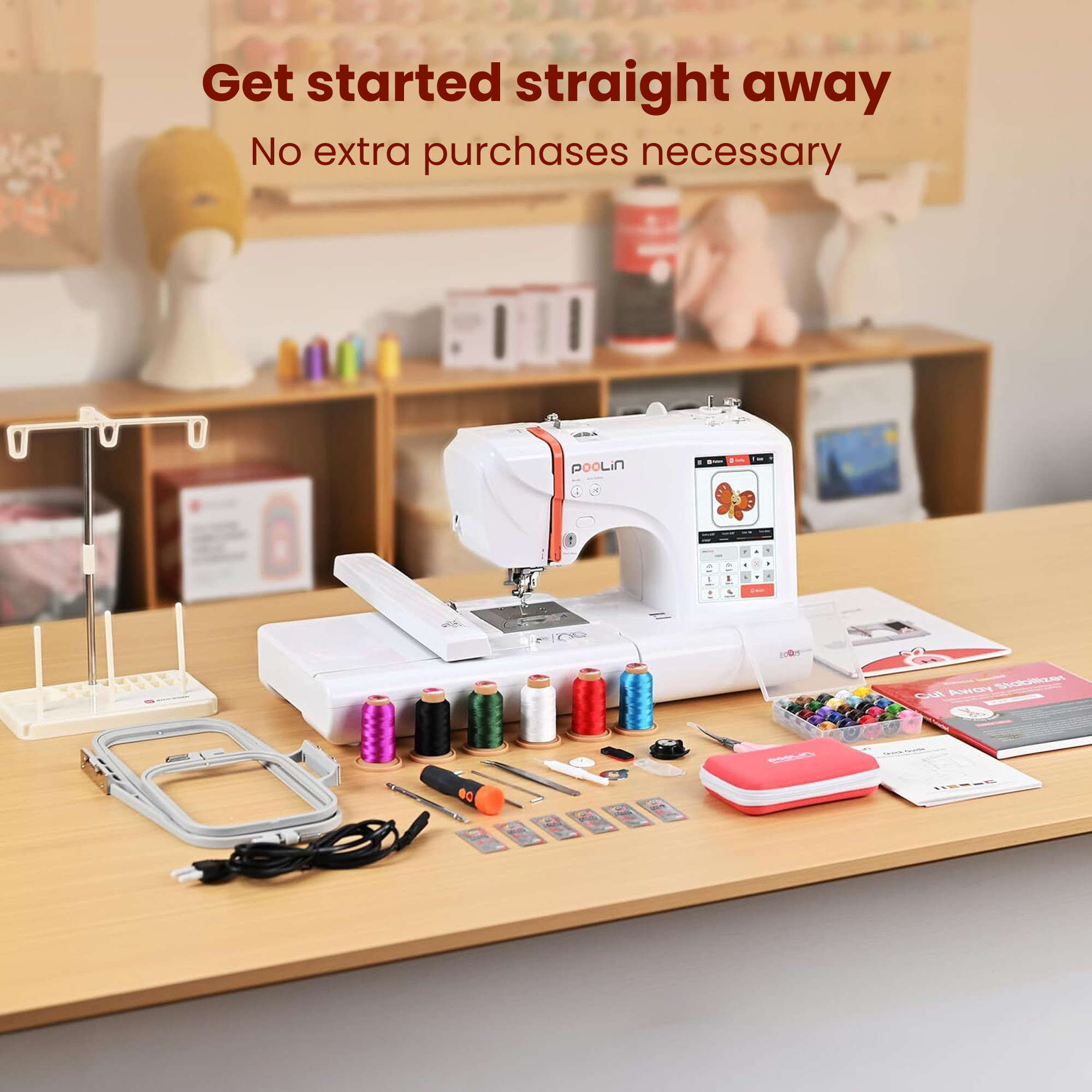 Your EOC05 embroidery machine arrives complete with 6 rolls of polyester thread in multiple colours, pre-wound bobbins, fabric stabiliser, two hoops, and multiple accessories.