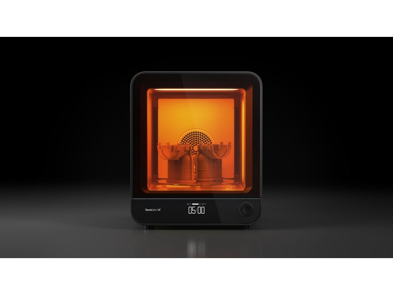 Na het wassen plaats je de onderdelen in de Form Cure, sluit je de deur en selecteer je de hars om te beginnen uitharden bij een geschikte temperatuur gedurende een vooraf ingestelde duur.