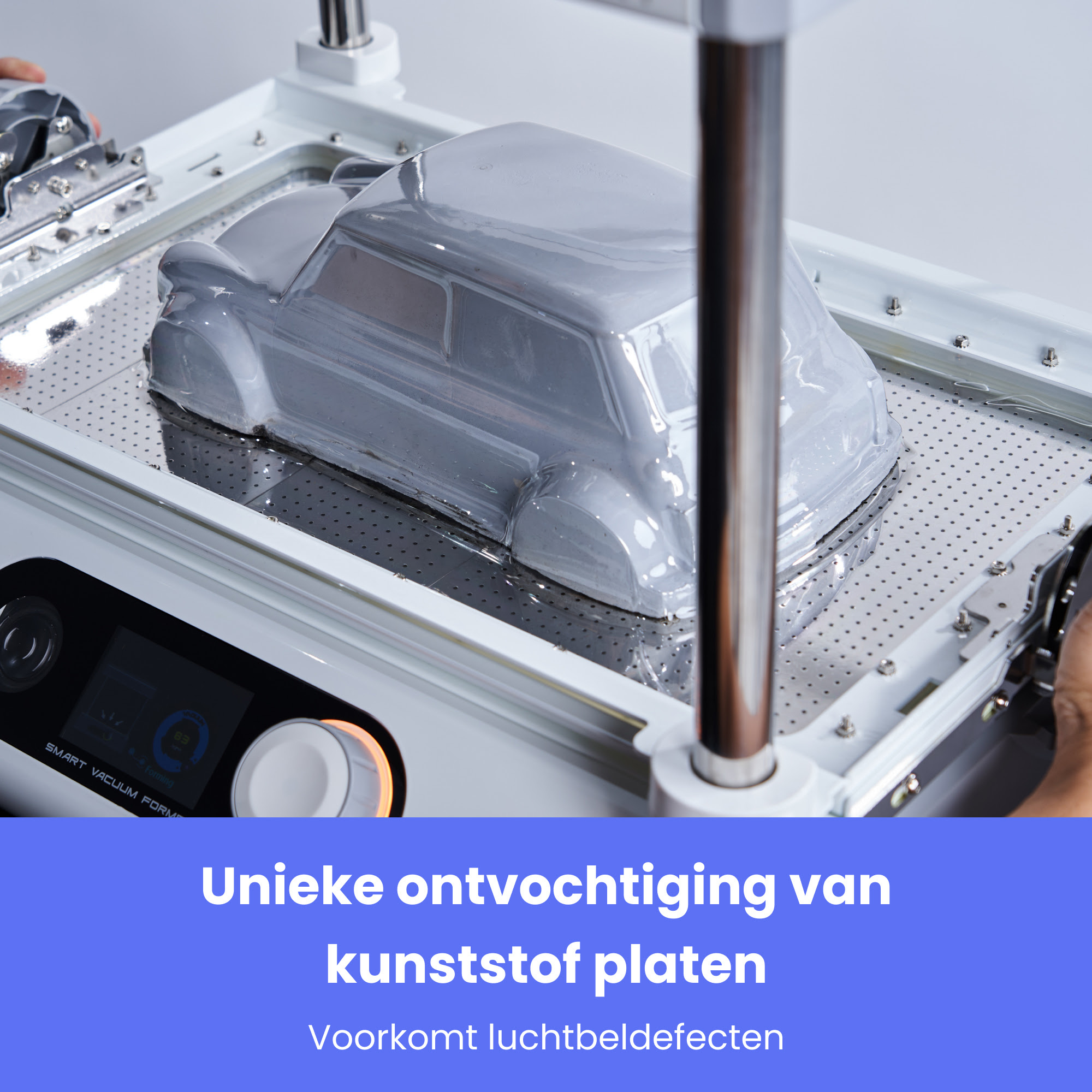 - Exclusief voorverwarmproces zorgt dat het slaag percentage van uw creaties aanzienlijk wordt verbeterd. Ingebouwde ontvochtigingsfunctie, die automatisch de ontvochtigingsparameters voor verschillende materialen van de platen kan regelen zorgt voor een easy workflow tijdens uw projecten.
