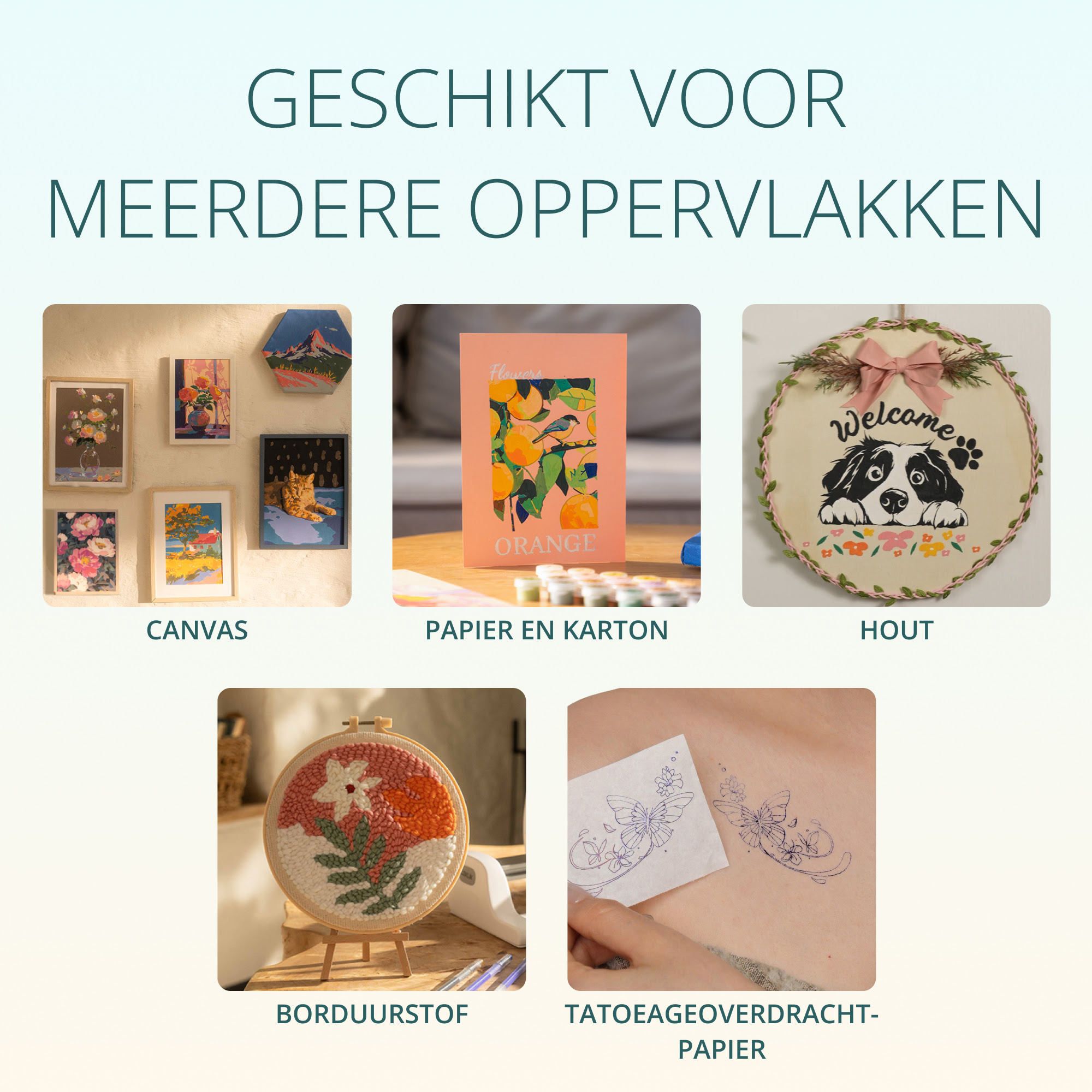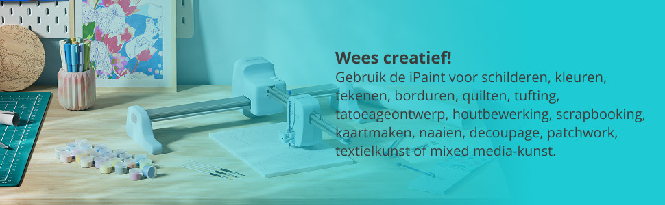 Maak unieke objecten en ontwerpen. De iPaint™ werkt op verschillende materialen (met een maximale hoogte van 16 mm). Versier je huis met doe-het-zelfprojecten zoals stickers, muurdecoraties, onderzetters of meubelversieringen. Ontdek gaandeweg nieuwe toepassingen en ontwerpen.