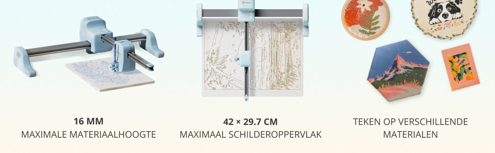 De iPaint™ maakt het mogelijk om te werken op een maximale oppervlakte van 42 x 30 cm (ongeveer A3). Dit grote werkoppervlak is ideaal voor hobby’s zoals schilderen, tekenen, borduren, quilten, tuften, tatoeageontwerpen, houtbewerking, scrapbooking, kaarten maken, naaien, decoupage, patchwork, textielkunst en mixed media.