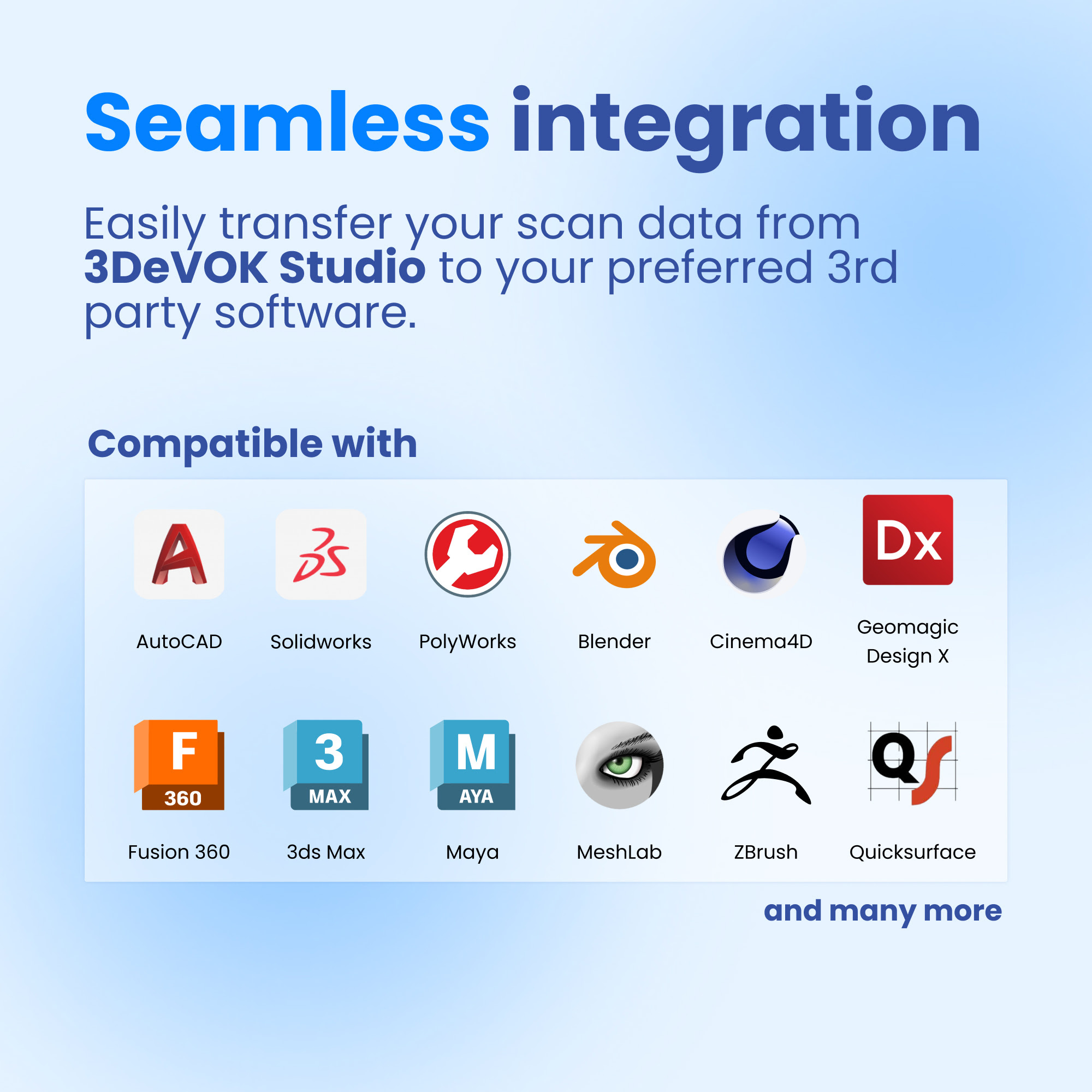 De 3DeVOK MT wordt geleverd met 3DeVOK Studio, professionele 3D-scansoftware zonder abonnementskosten. Functionaliteiten omvatten: