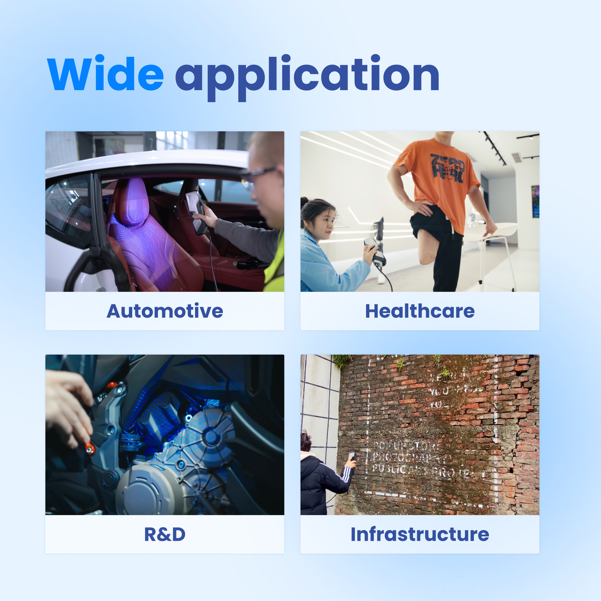 - Infrarood spikkelmodus: Geschikt voor grotere objecten zoals mensen, sculpturen of anatomische modellen, met opties voor zowel snelle dataverzameling als gedetailleerde scans.