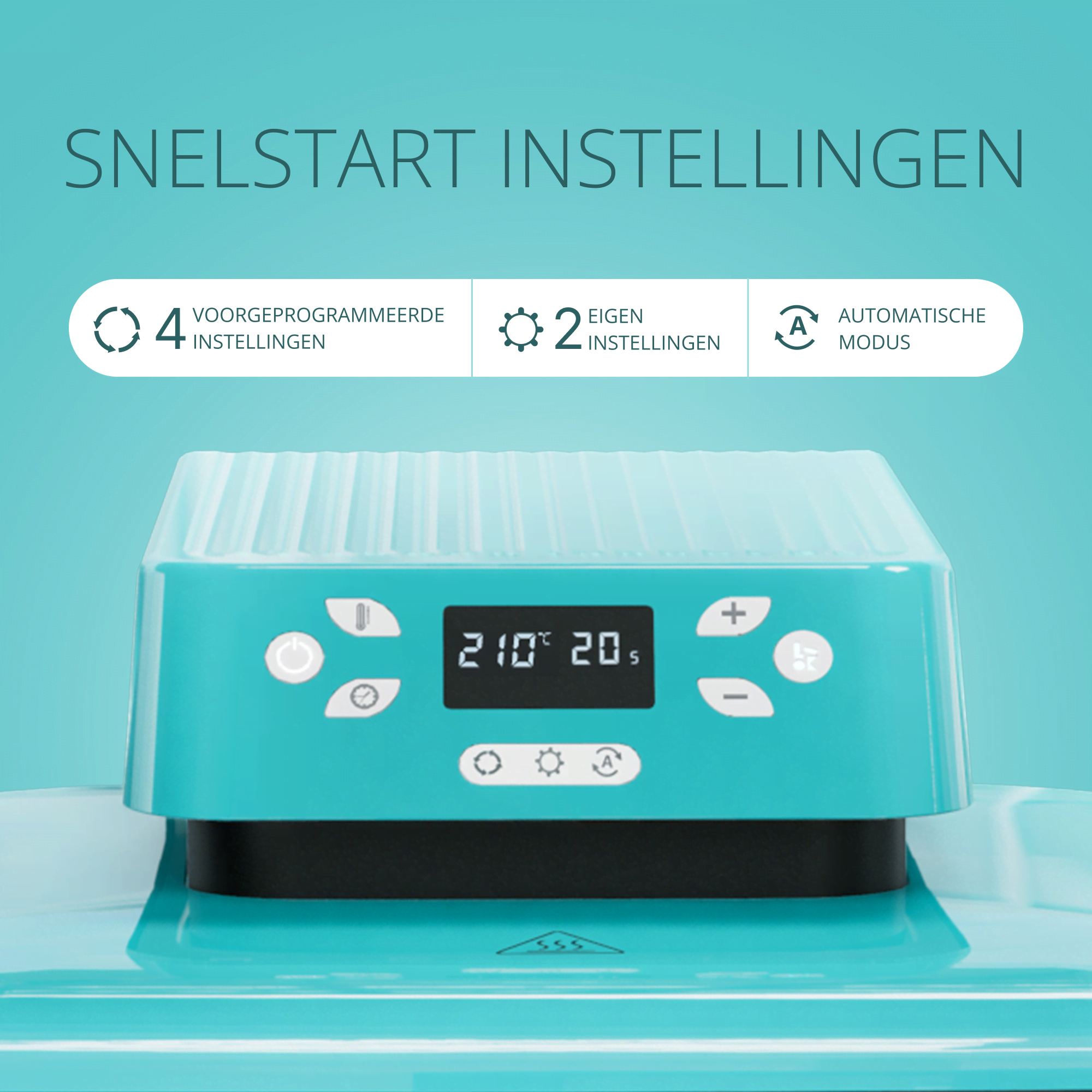 Geavanceerde verwarmingstechnologie: De Auto Heat Press warmt snel en gelijkmatig op en bereikt 210 °C in minder dan 6 minuten en 160 °C in slechts 4 minuten. Met een ingebouwde motor met twee verwarmingszones, NTC-elementen en thermistortechnologie voor een gelijkmatige verwarming.