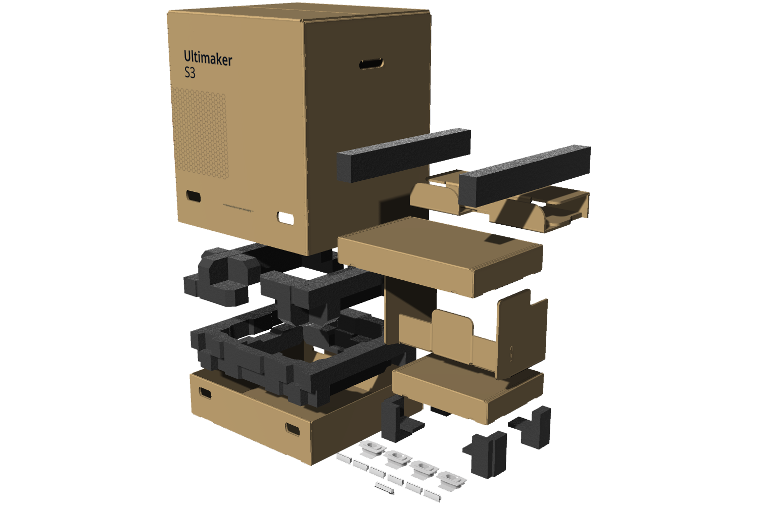 Deze set bevat alle onderdelen die nodig zijn om de UltiMaker S3 correct opnieuw te verpakken. Inbegrepen zijn de buitenste kartonnen tray en doos, beschermend schuim, interne kartonnen materialen, de vier clips om de doos te vergrendelen en de rubberen deurdichtingen.