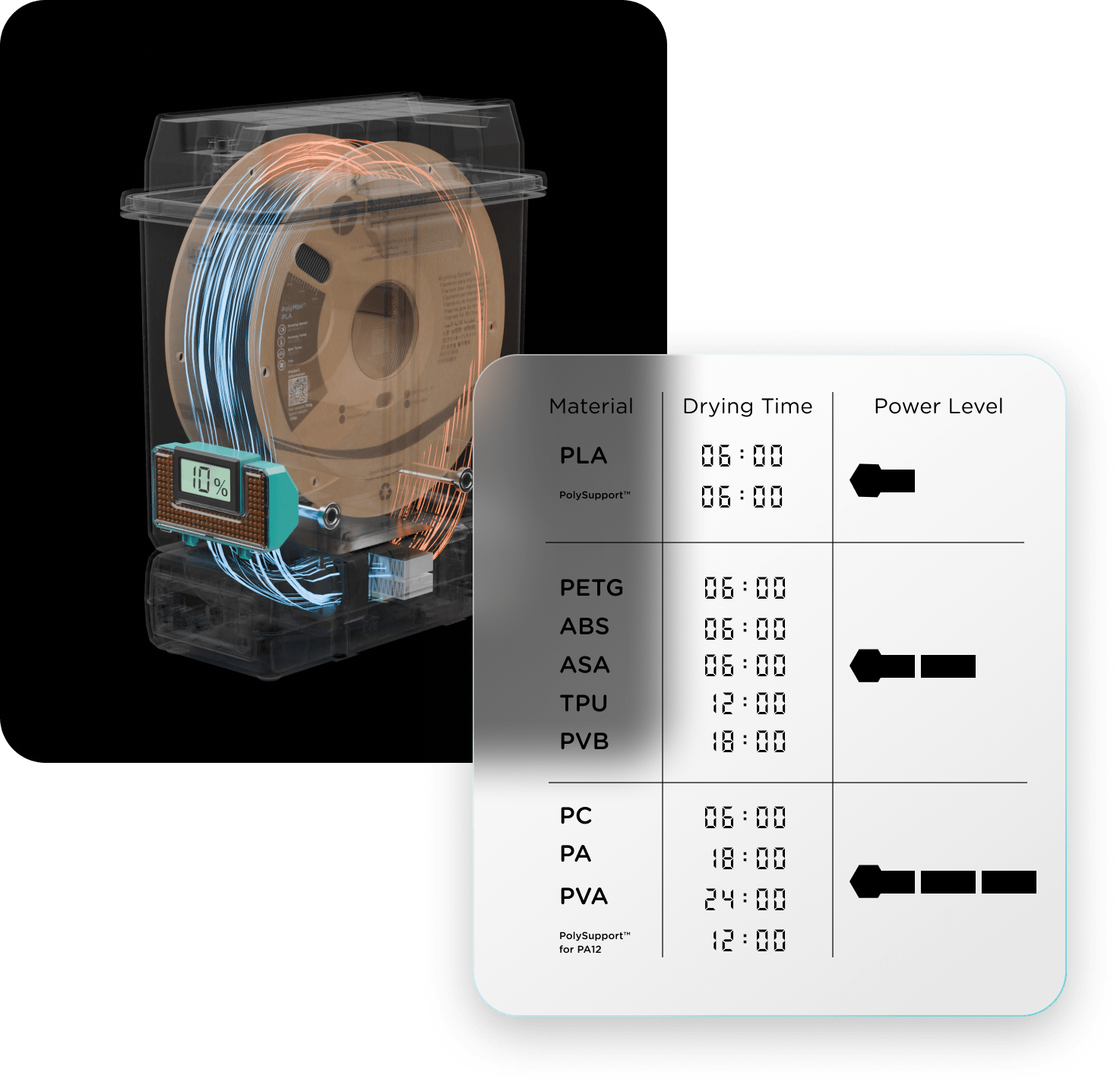 Herstel je vergeten filamentrollen met gemak. De 360° luchtstroom droogt je filament gelijkmatig zonder schade.