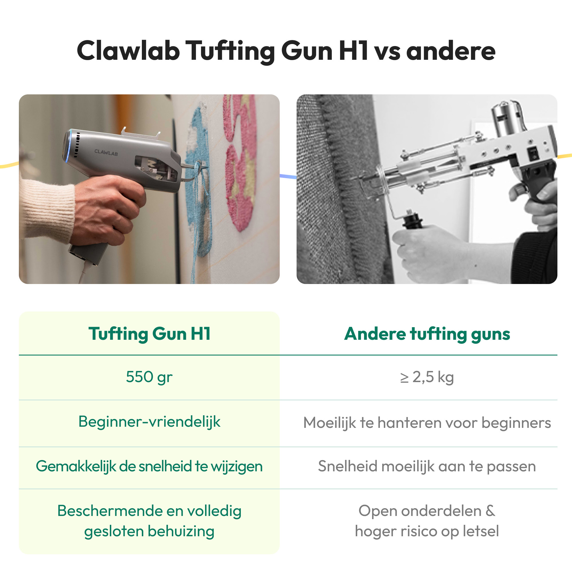 De high-performance Clawlab Tufting Gun H1 is geschikt voor beginners en ervaren artiesten. Lichtgewicht, zodat je urenlang comfortabel kunt tuften zonder vermoeid te raken. Met instelbare snelheden en een stabiele motor heb je volledige controle over elke lijn, curve en textuur.